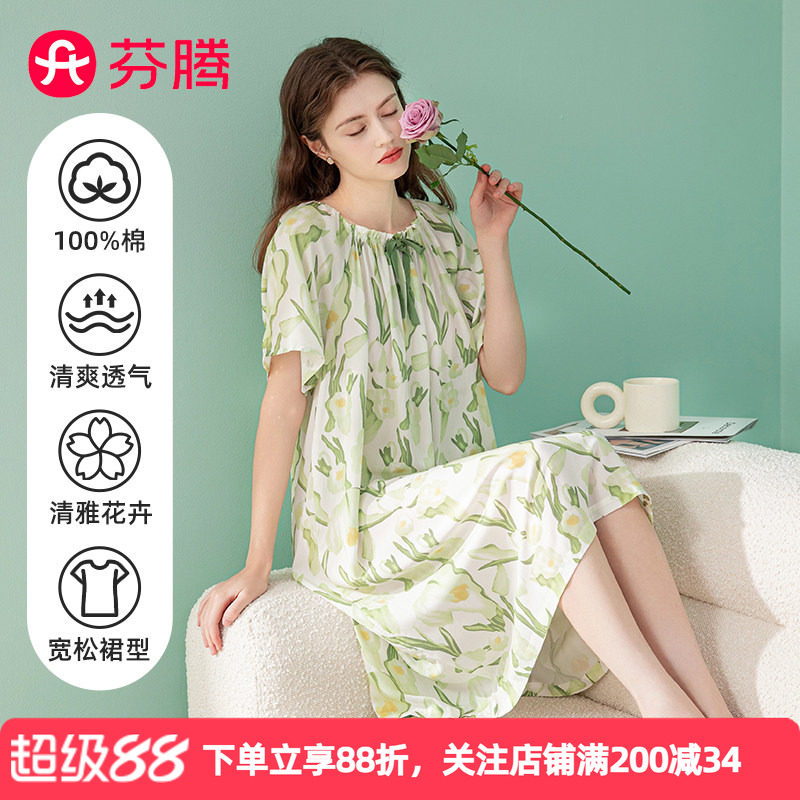 芬腾睡裙薄款弹性娃娃领短袖蝴蝶结家居田园风睡裙花女夏季家居服满99元减34元